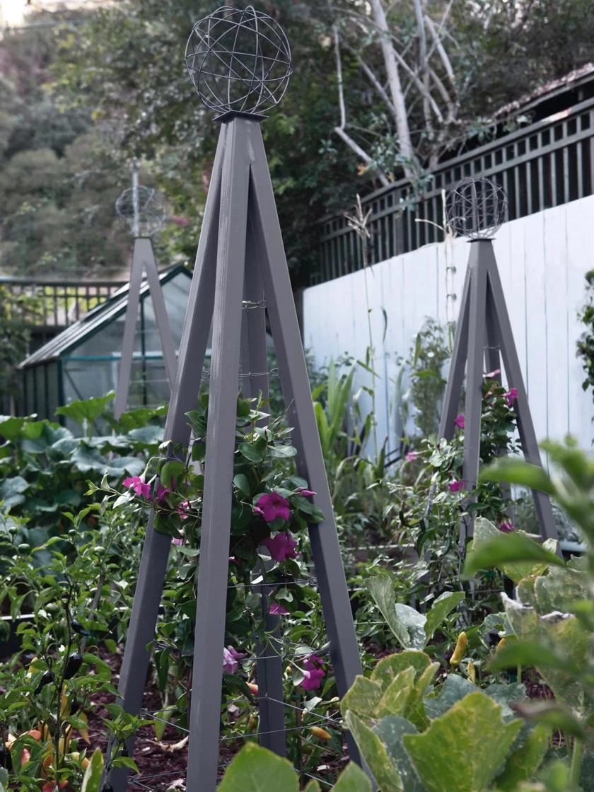 Create an instantly stylish garden with this contemporary obelisk topped with a sculptural stainless steel sphere by Terra Trellis. Use to train plants that climb or need support, or place in the garden for simple architectural punch. During the off-season, this tuteur becomes a striking work of art. Designed and hand-crafted in the U.S. from steel and stainless steel cable, finished in brilliant water-resistant powdercoat colors or a natural oxide patina. A sturdy structure for edible or ornamental gardens, great on the ground or on patios with containers. Very impactful in multiples.