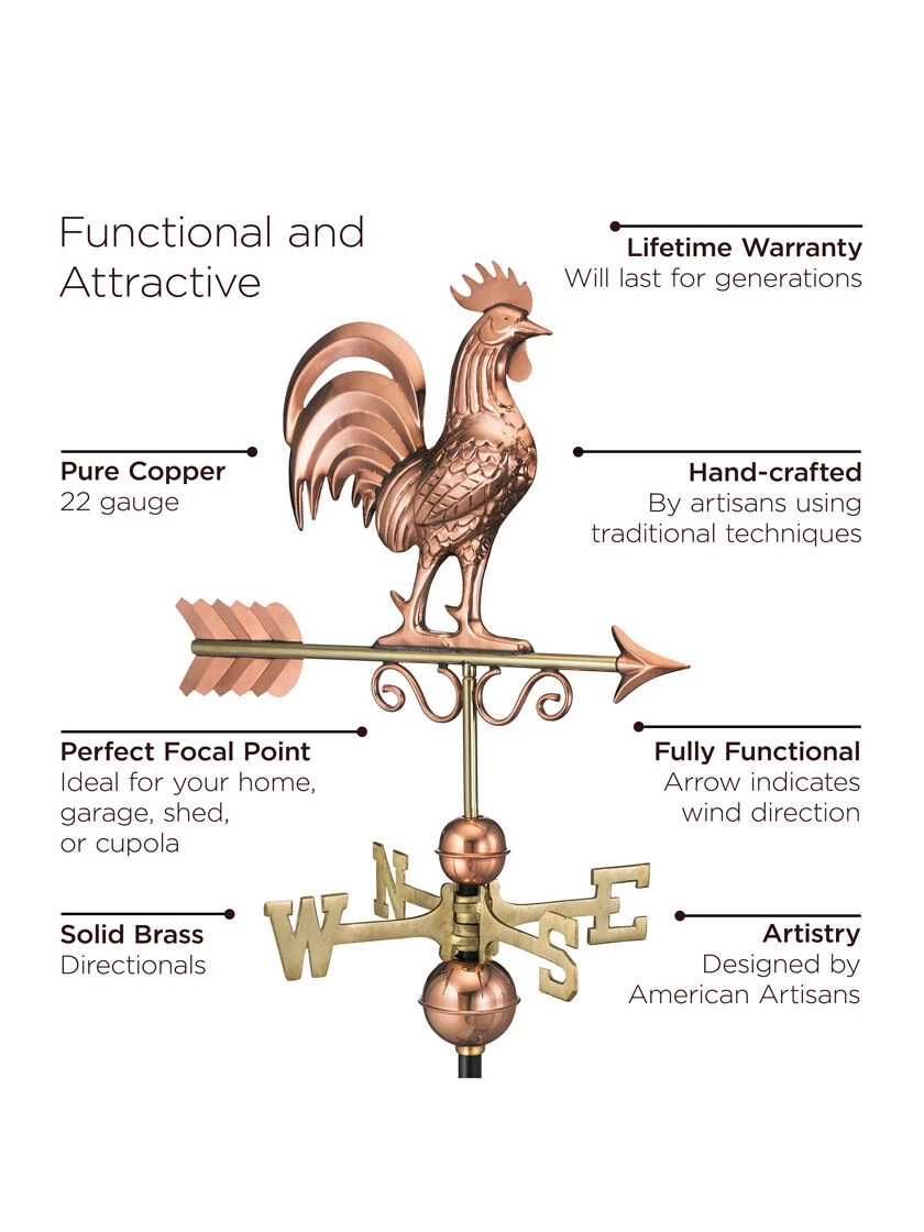 Crafted with an intricate attention to detail, these Bantam Rooster Weathervanes hearkens back to a simpler time. For over 35 years Good Directions Pure Copper Weathervanes have been unsurpassed in style, quality, and durability – perfect for the house-proud homeowner. Bring the Joy of Outdoor Living℠to your home with this heirloom-quality piece. Does not include a roof mount. The pure copper will age naturally over time.