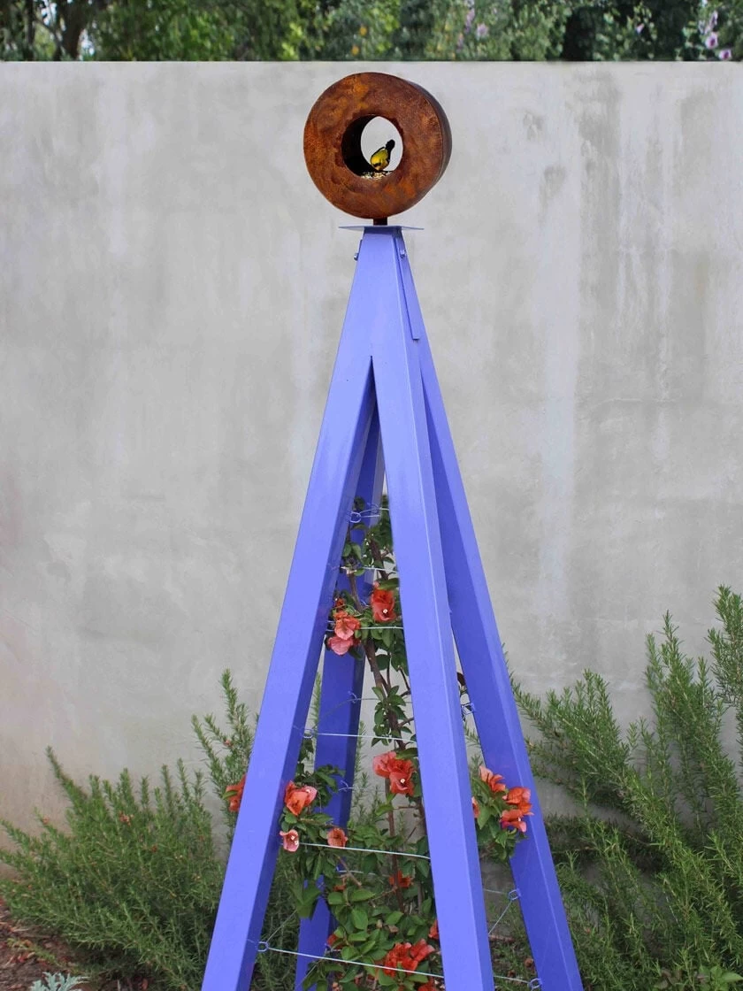 The sculptural Bird Cafe is a modern feeder for feathered friends who call your garden their home. The Bird Cafe together with the Akoris Garden Tuteur provides a stunning garden eco-system for flora and avians. The Bird Cafe has a natural steel oxide finish and the steel trellis is finished in brilliant water-resistant powder-coated colors or a natural oxide patina. Designed and crafted in the U.S.A this modern, rustic habitat is something the hippest of birds will tweet about!