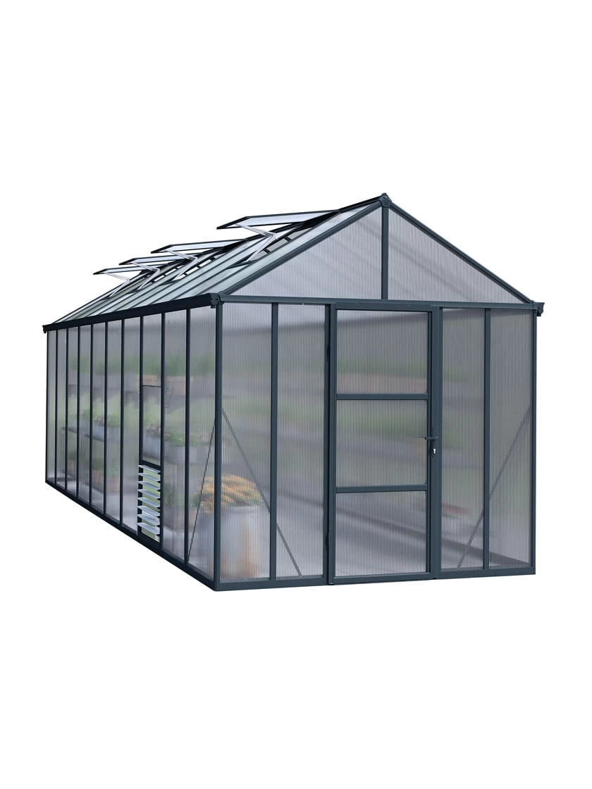 This greenhouse also includes a full galvanized, rust-resistant steel base kit, crucial for adding height, structural support, stability and alignment. It is aesthetically pleasing with its elegant, dark anthracite powder coated finish and its robust aluminum framework. The Glory greenhouse is built from high quality materials for long, lasting use. The greenhouse itself features 10 mm Twin-Wall 100% UV-protected, light-diffusing polycarbonate panels with over 90% light transmission and provides a comfortable, insulated environment for growing your plants. The virtually unbreakable, thick panels also protect plants from harsh weather conditions such as hail, snow and frost and provide additional insulation.