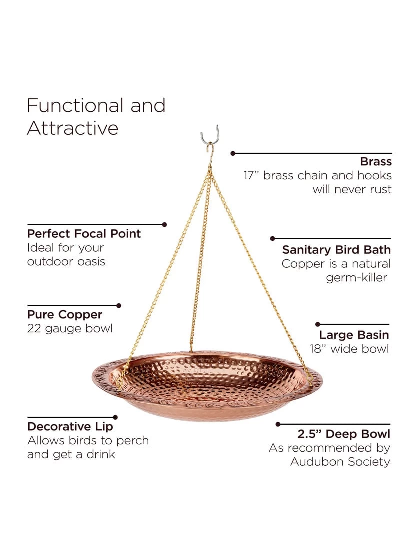 The piece doubles as a focal point that adds to the ambiance of any outdoor area. Birders will gaze in awe as their feathered-friends splash and play throughout the day. A decorative-lip encircling the bowl provides space for birds to perch. Durable by design, this bird bath is built to last with a pure copper bowl and chains of brass. Easily hang from a hook and watch with delight.